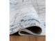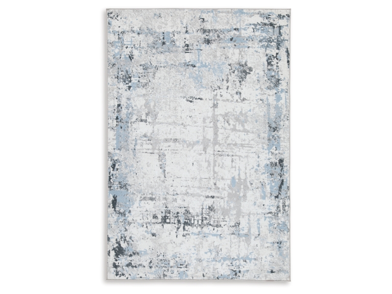 Machine woven, abstract design in shades of blue, white and gray. 15mm pile. Polyester, backed with cotton. Machine washable. Rug pad recommended.