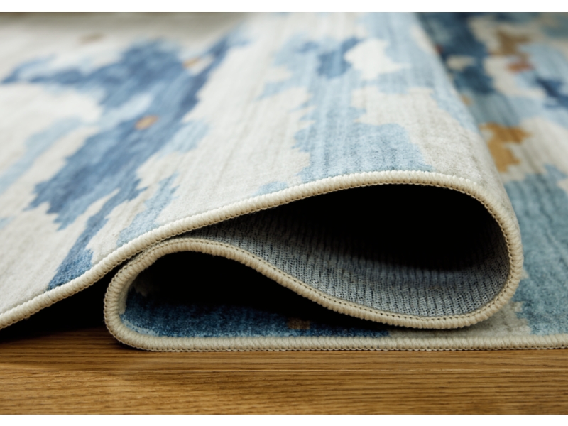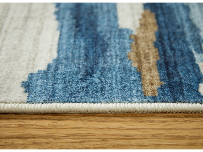 Machine woven, printed abstract design in shades of cream, blue, brown, ocher and clay. 7mm pile. Polyester, backed with TPR/polyester/cotton blend. Machine washable. Rug pad recommended.