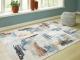 Machine woven, printed abstract design in shades of ivory, blue, orange, green, gray and black. 7mm pile. Polyester, backed with TPR/polyester/cotton blend. Machine washable. Rug pad recommended.