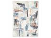 Machine woven, printed abstract design in shades of ivory, blue, orange, green, gray and black. 7mm pile. Polyester, backed with TPR/polyester/cotton blend. Machine washable. Rug pad recommended.