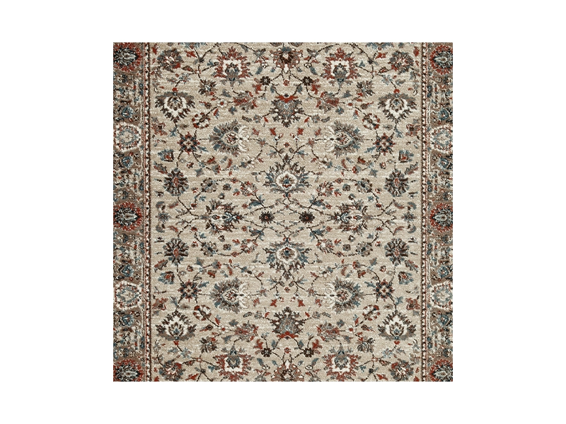 Machine woven, floral design in shades of blue, brown, rust and cream. 10mm pile. Polypropylene, backed with jute/polyester blend. Spot clean only. Rug pad recommended.