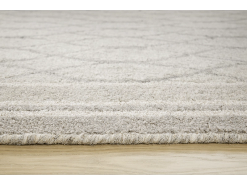 Table tufted, bordered trellis design in shades of gray. 10mm pile. Wool, backed with cotton. Spot clean only. Rug pad recommended.