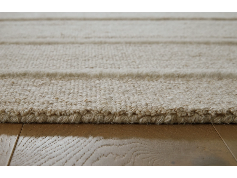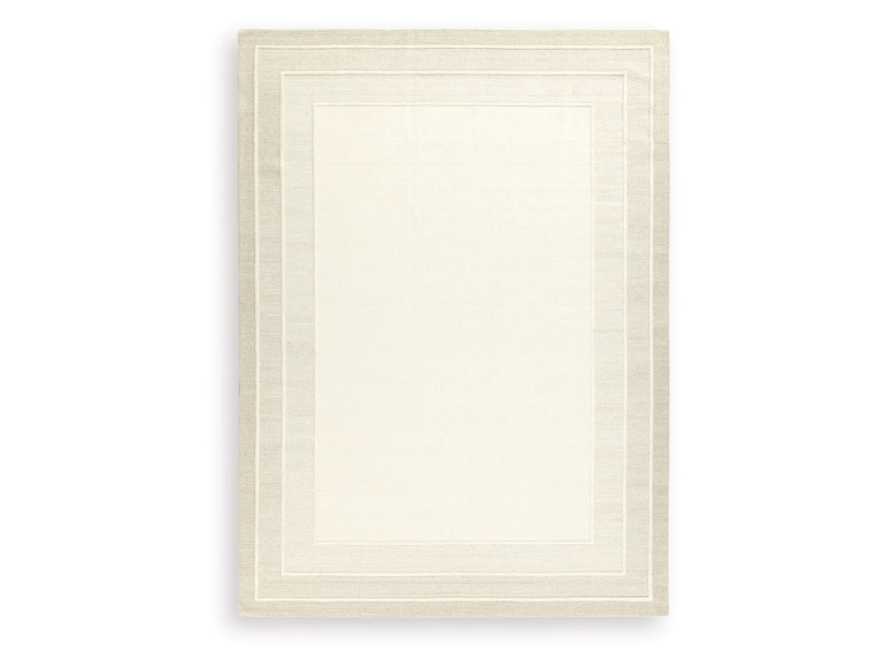 Hand tufted, border design in shades of ivory and tan. 8mm pile. Wool, backed with cotton. Spot clean only. Rug pad recommended.
