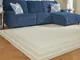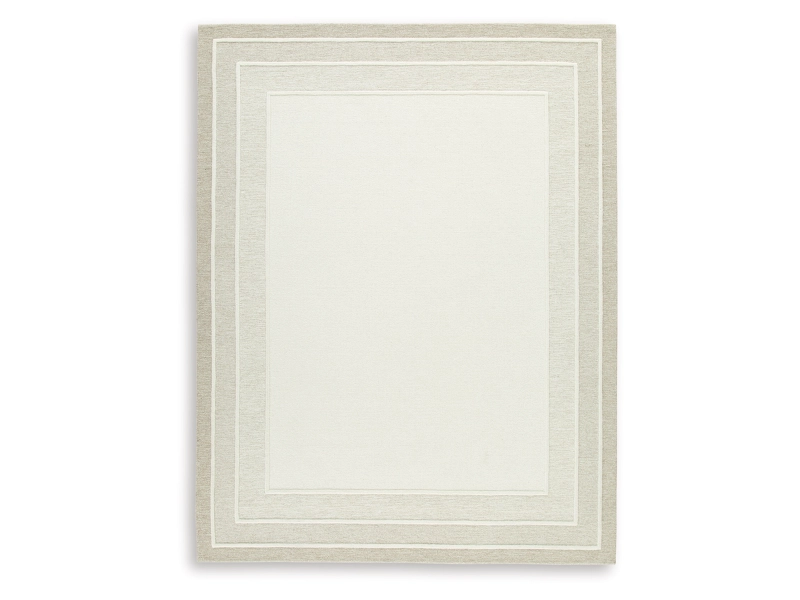 Hand tufted, border design in shades of ivory and tan. 8mm pile. Wool, backed with cotton. Spot clean only. Rug pad recommended.