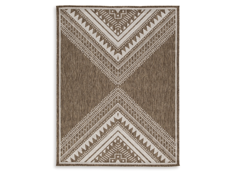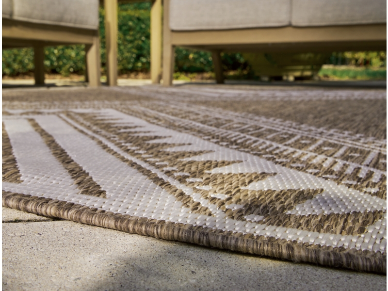 Machine woven, global design in brown and cream. Indoor/outdoor safe. No pile. Heat set polypropylene, backed with latex. Spot clean only. Rug pad recommended.