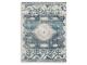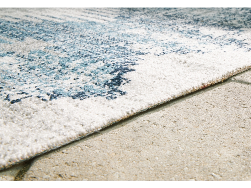Machine woven, medallion design in shades of blue, gray and ivory. Indoor/outdoor safe. 2mm pile. Polyester/polypropylene blend, backed with latex. Spot clean only. Rug pad recommended.