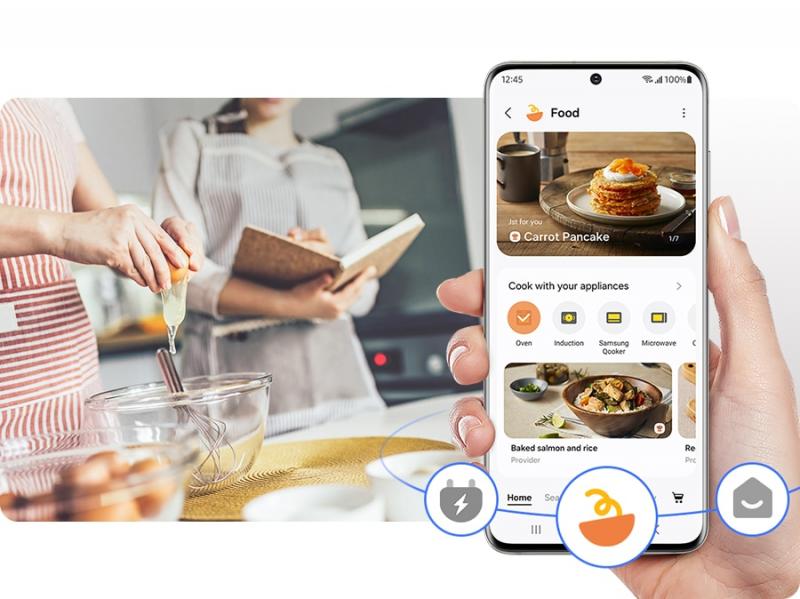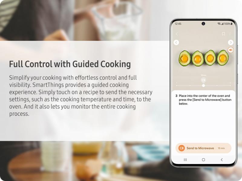 Enjoy a simple and fun way to cook and plan meals using SmartThings Cooking in the SmartThings App*. You can monitor and control the microwave oven's functions and settings. It recommends a cooking mode, suggests personalized recipes and meal plans, enables grocery shopping and offers an interactive experience.