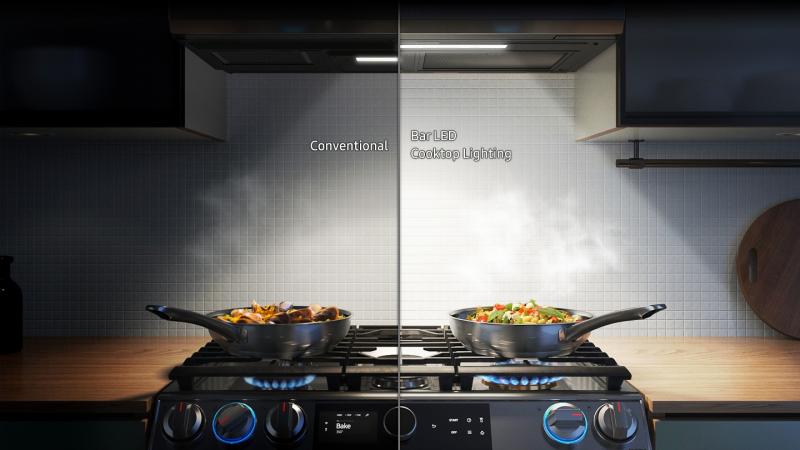 See what you’re cooking easily. Bar LED Cooktop Lighting spreads light evenly over your entire cooktop and is 59% brighter on average* than Samsung's conventional OTR. It is also highly energy efficient, so it uses less power than halogen lighting**.