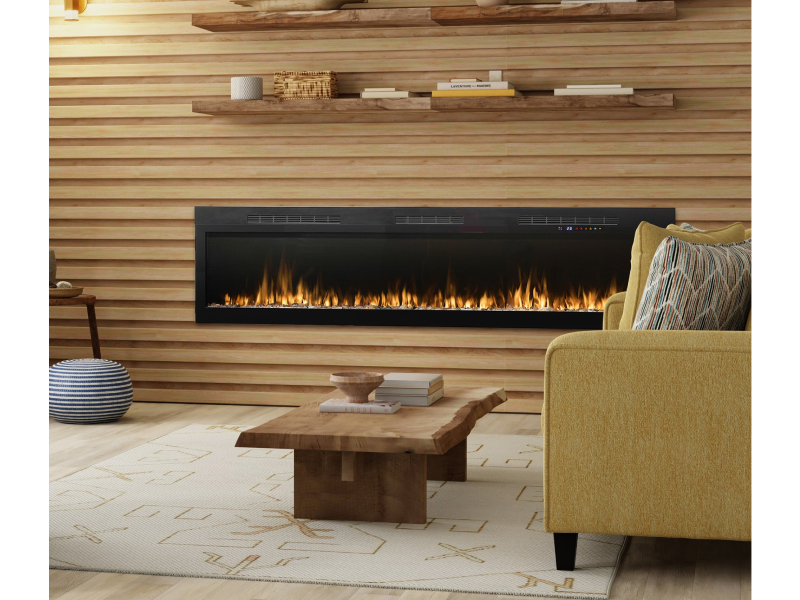 The Vital Sense 74" Linear Electric Fireplace is the ultimate statement piece for open-concept homes and expansive living areas. Its low-profile design recesses into 2x6 walls, creating a seamless modern finish. The wide flame display can be personalized with 13 flame colors, three speeds, and three brightness levels, while the ember bed can be styled to match your décor. A fan-forced heater efficiently warms spaces up to 1,000 sq. ft., or enjoy the flames without heat for year-round ambiance.