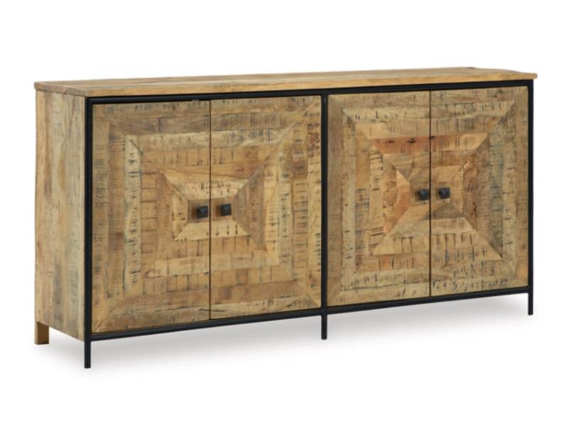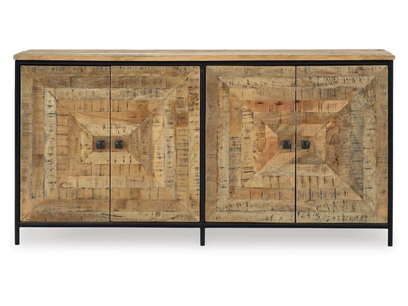 Bold in scale and rich in character, the Camney accent cabinet makes a dramatic backdrop for entertaining. Its square patterned door fronts boast a saw mark effect, while black accents lend industrial appeal to the design. Radiating an aura of welcoming warmth, this piece fills your home with effortless elegance.