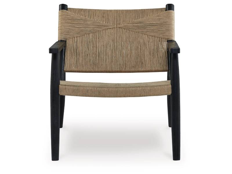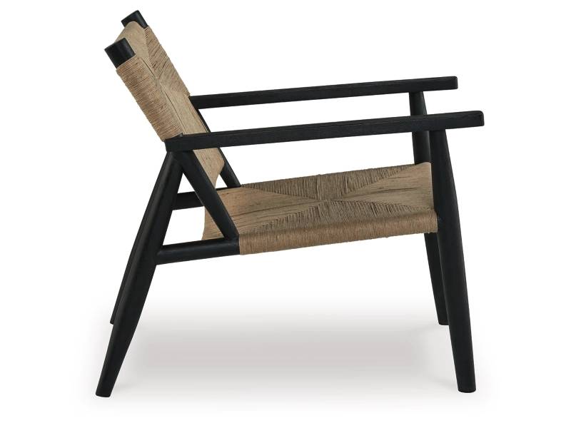 Understated style done beautifully well. The Halfmore accent chair's natural jute upholstery offers a striking contrast with its black wood frame. Combining a contemporary aesthetic with a mid-century vibe, it's ideal for the living room or bedroom.