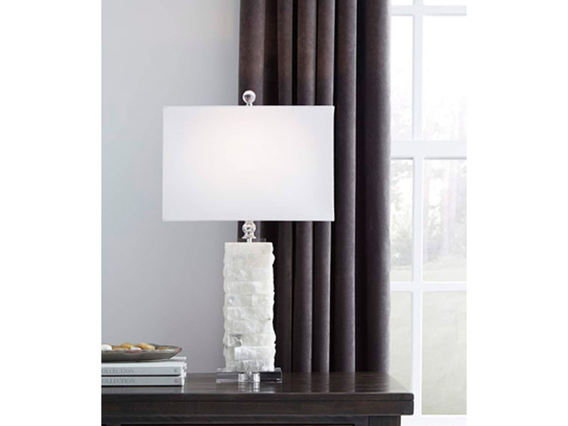 - Made of alabaster and acrylic with a rectangular hardback shade