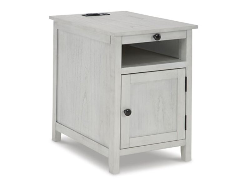 Add big character to a small space with this chairside end table. With its compact size and strong silhouette, it can go anywhere and blend easily into the decor. Less is so much more with the Shaker-inspired design and whitewashed wood grain finish. Loaded with form and function, this end table displays accent pieces and stores essentials securely while keeping devices powered up.