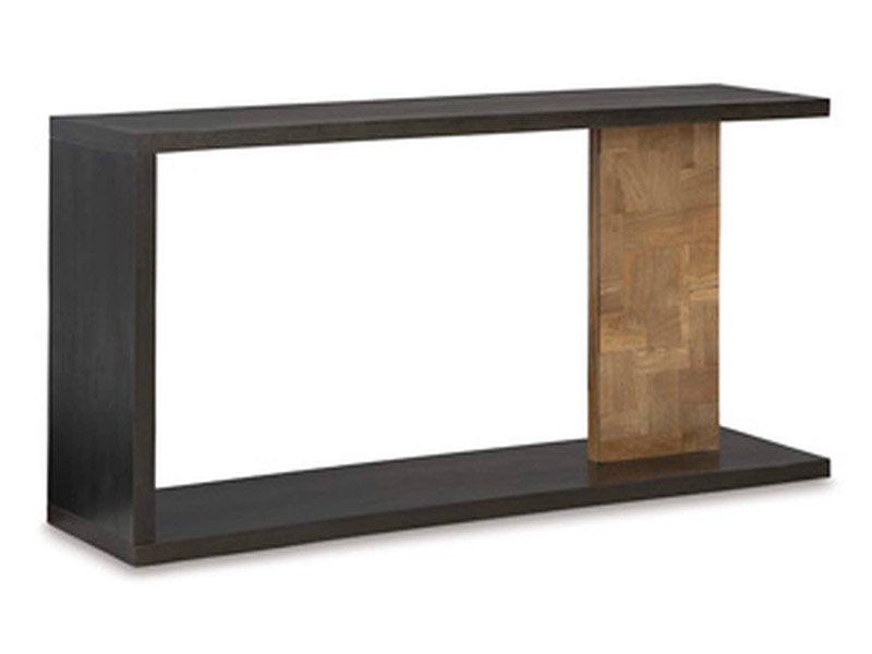With its clean lines and sense of simplicity, the Camlett console table is a master study in modern style. We love how the contrasting patchwork patterned post and the dark brown finish captivate the eye. The lower shelf enhances the open and airy design and provides great display space.