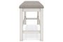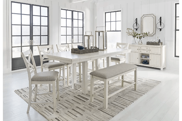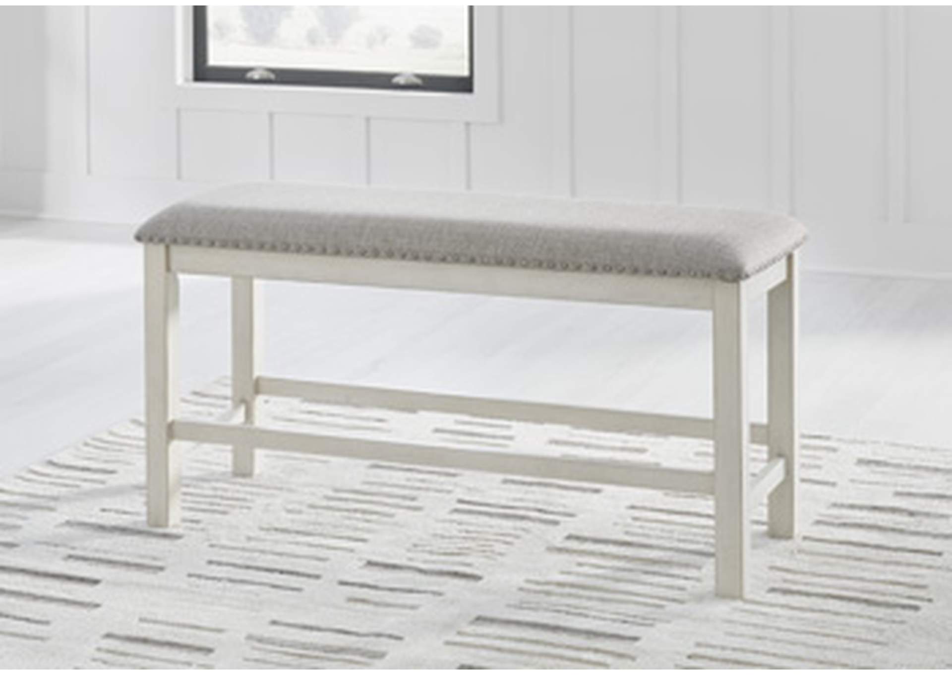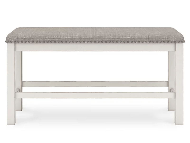 The Robbinsdale counter height dining bench is sure to impress come mealtime. With its white finish and light gray upholstery, farmhouse-style seating has never been so fashionable.