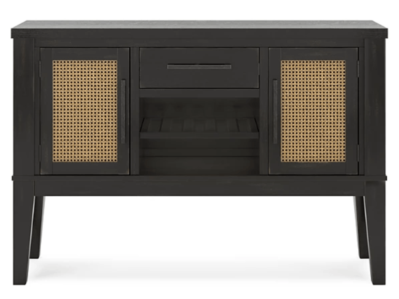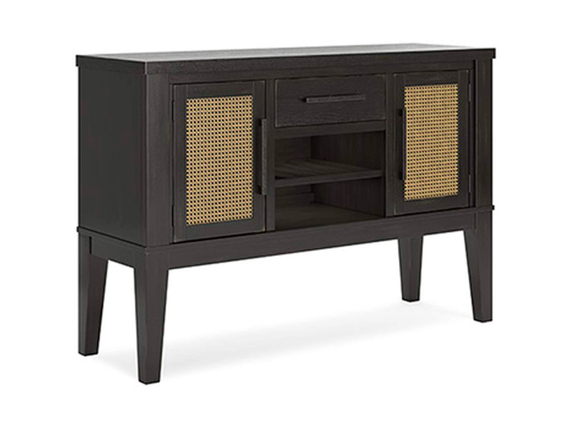 The Galliden dining server brings a rustic vibe to urban contemporary design. It’s a modern approach to natural beauty, with faux cane accents incorporating eye-catching texture. Chic storage is made possible with a reversible wine rack shelf, a drawer and cabinets. And the server’s color palette is stunningly simple, allowing it to coordinate seamlessly with your existing decor.