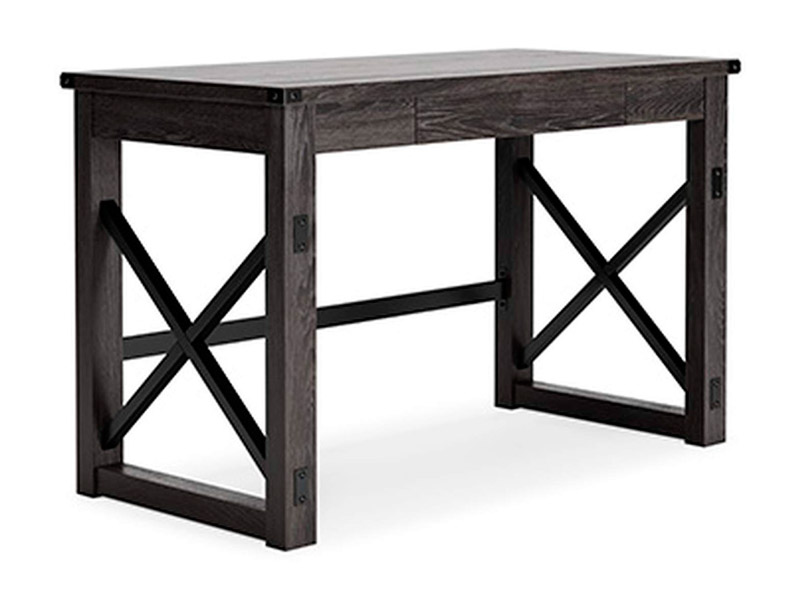 Love an urban farmhouse aesthetic? Make it work to your advantage with this beautifully styled desk. This simply striking choice in home office furniture has an unmistakable farmhouse feel thanks to design elements including a gray decorative wood grain laminate contrasted with crossbuck rails, metal accents and a stretcher in black. Perfect for office supplies, the desk includes a handy center drawer with hardware-less aesthetic to help keep your desk top clutter free