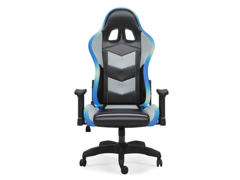 Tech this out: a swivel office chair that’s as cool as it is comfortable. The ultimate choice among gamers, the Lynxtyn swivel office chair is hard to beat. Quality crafted with a sturdy steel frame, this swivel office chair with comfy contoured seat and cutting-edge design is upholstered in a durable faux leather in gray and black. Cleverly integrated into the chair: powered LED lighting to enhance the gaming experience. Choose from six different colors or stream a mix of color using the remote control. With a swivel base, smooth-gliding casters and adjustable seat height/tilt feature, this office chair with fully reclining backrest has serious game.