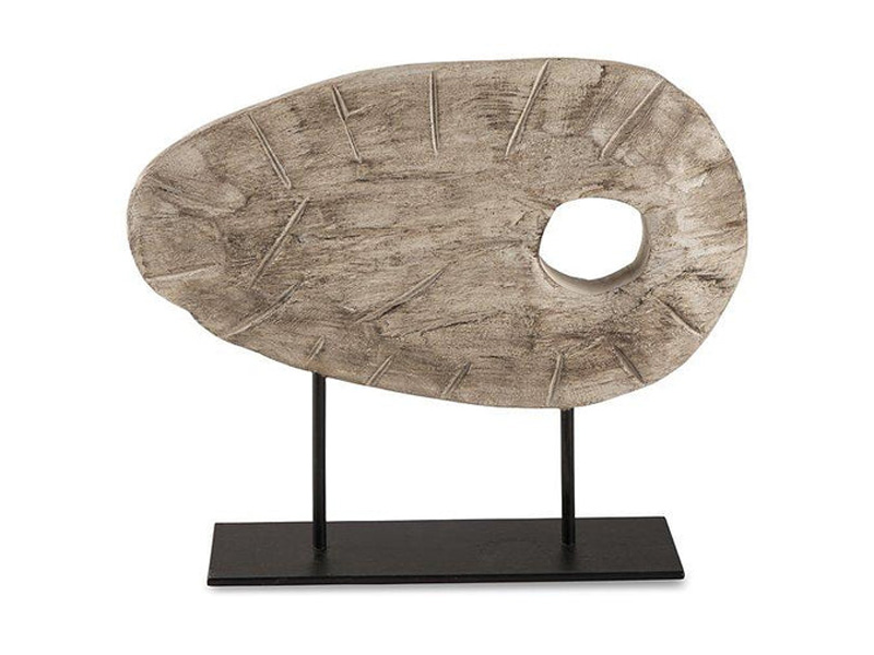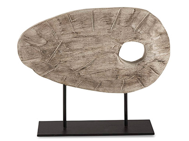 Elegantly adorn your bookshelf, mantel or dining table with this sculpture. Wood in an antiqued white finish is brimming with natural beauty and adds warmth to your space. A sleekly styled black metal base grounds the piece.