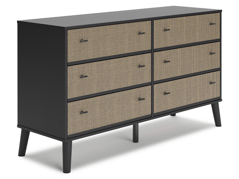 Put a retro spin on current trends with this dresser. Its mixed-material look of matte black and replicated beige cane brings a casually cool feel to your bedroom. Simple, sleek hardware and splay legs round out the urban meets mid-century vibe.