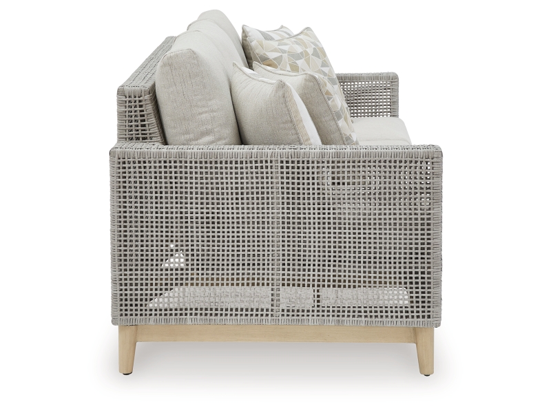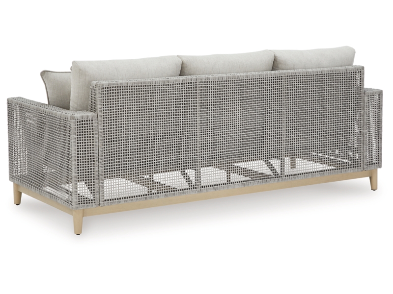 The Seton Creek sofa invites your casual contemporary style outdoors. With its resin wicker in a chic neutral hue, it expertly marries refined design with durability. Breezy summer mornings and cold winter nights are made all the more comfortable with high-performance Nuvella+™ fabric covering the cushion.