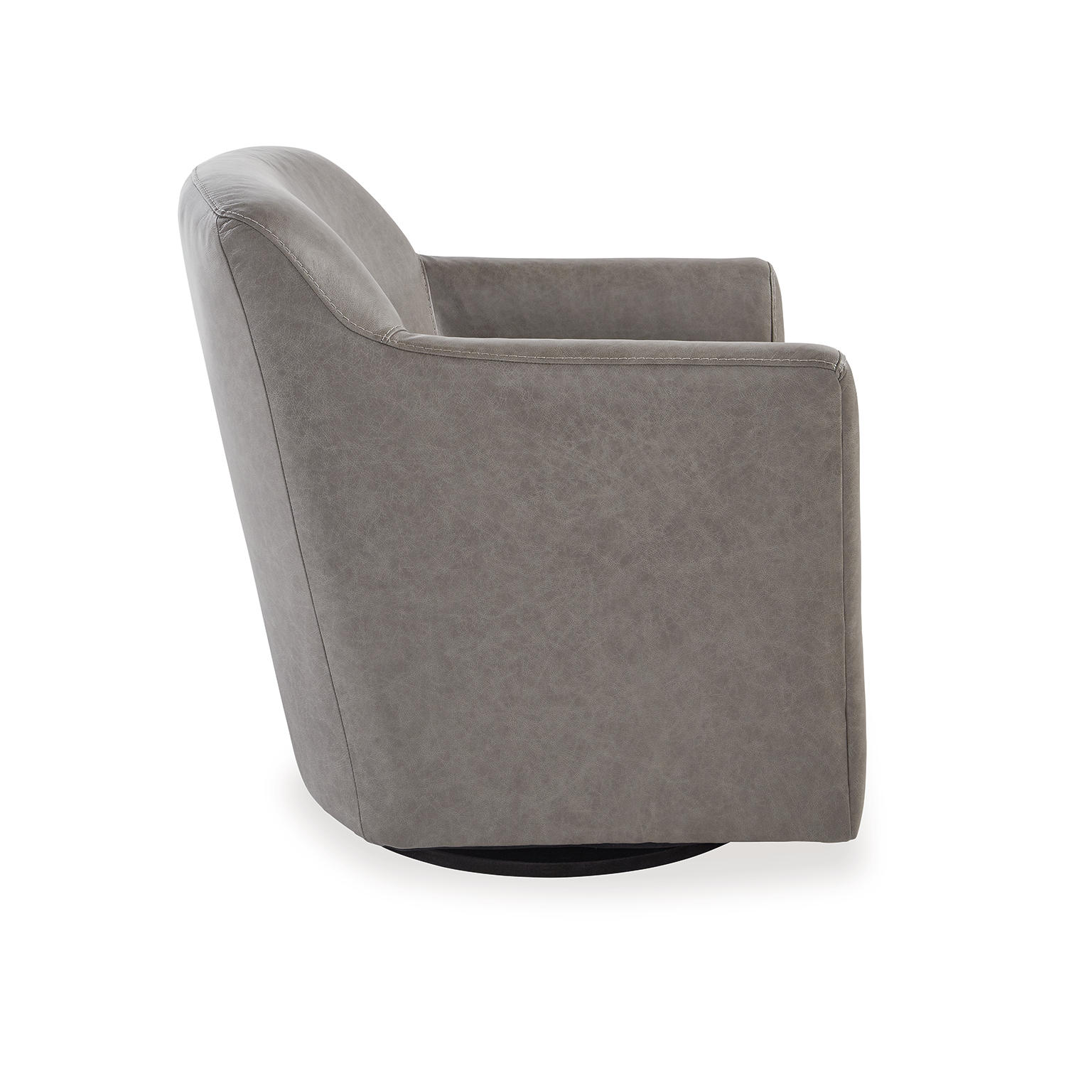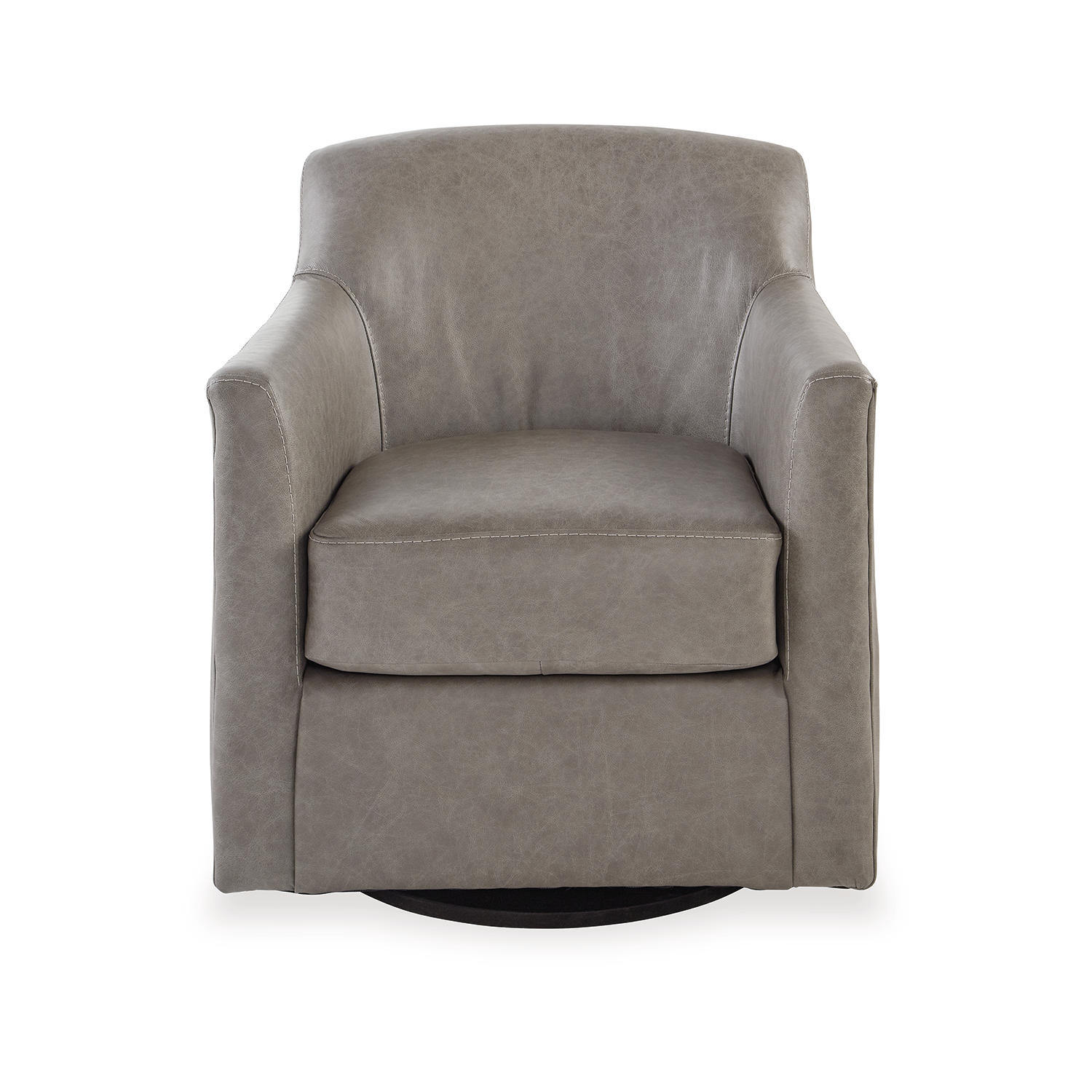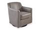 Accent chair. Shelter arm. Leather match upholstery in fossil. Tight back and loose, non-reversible seat cushion. Metal swivel base. Coordinating stationary group 57303.