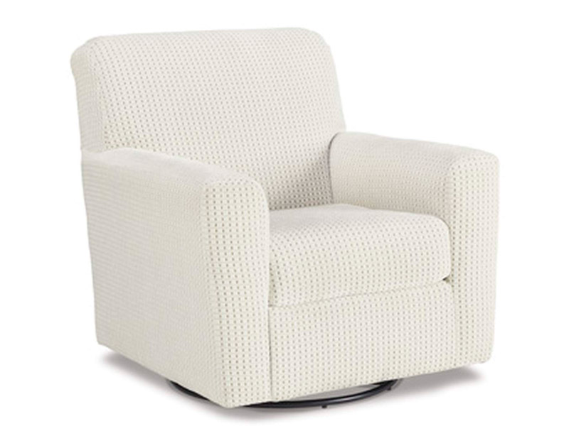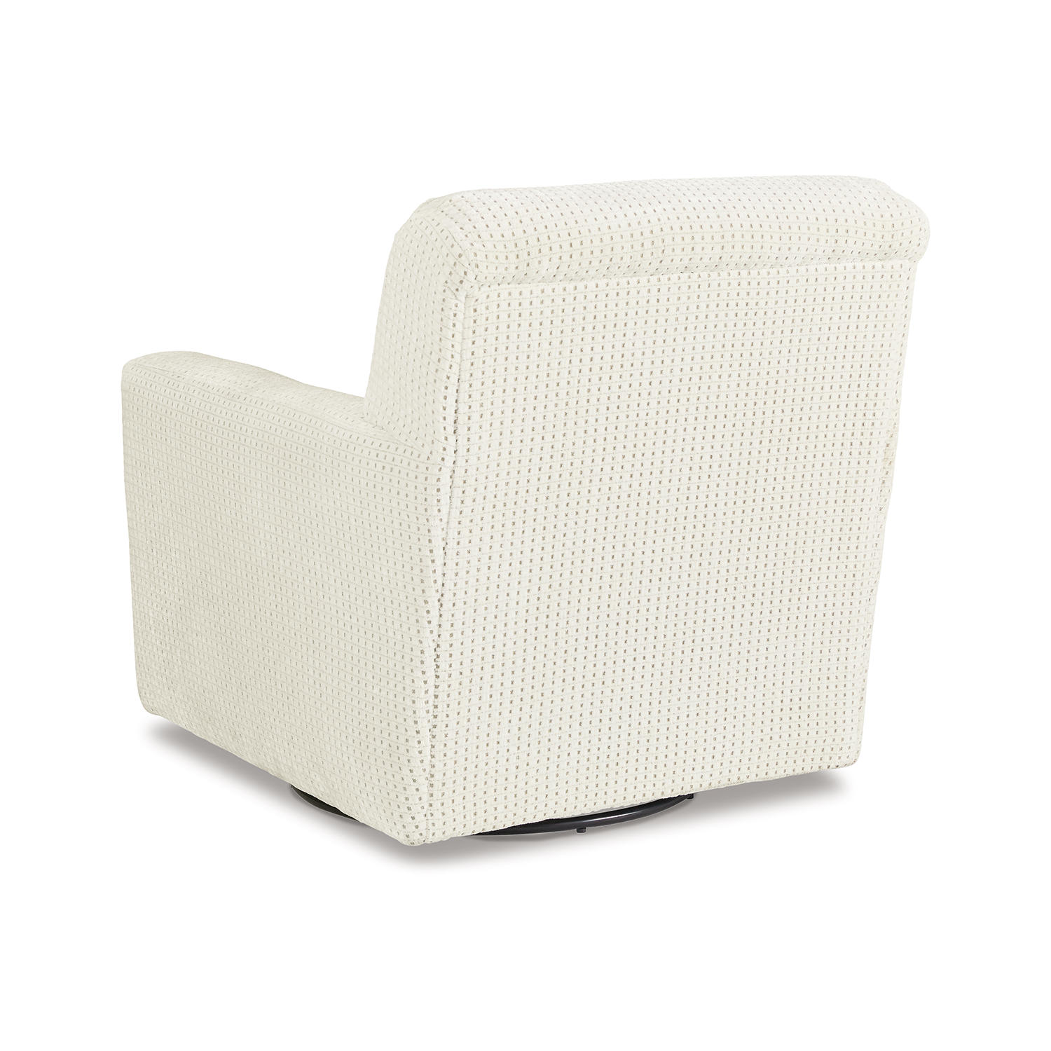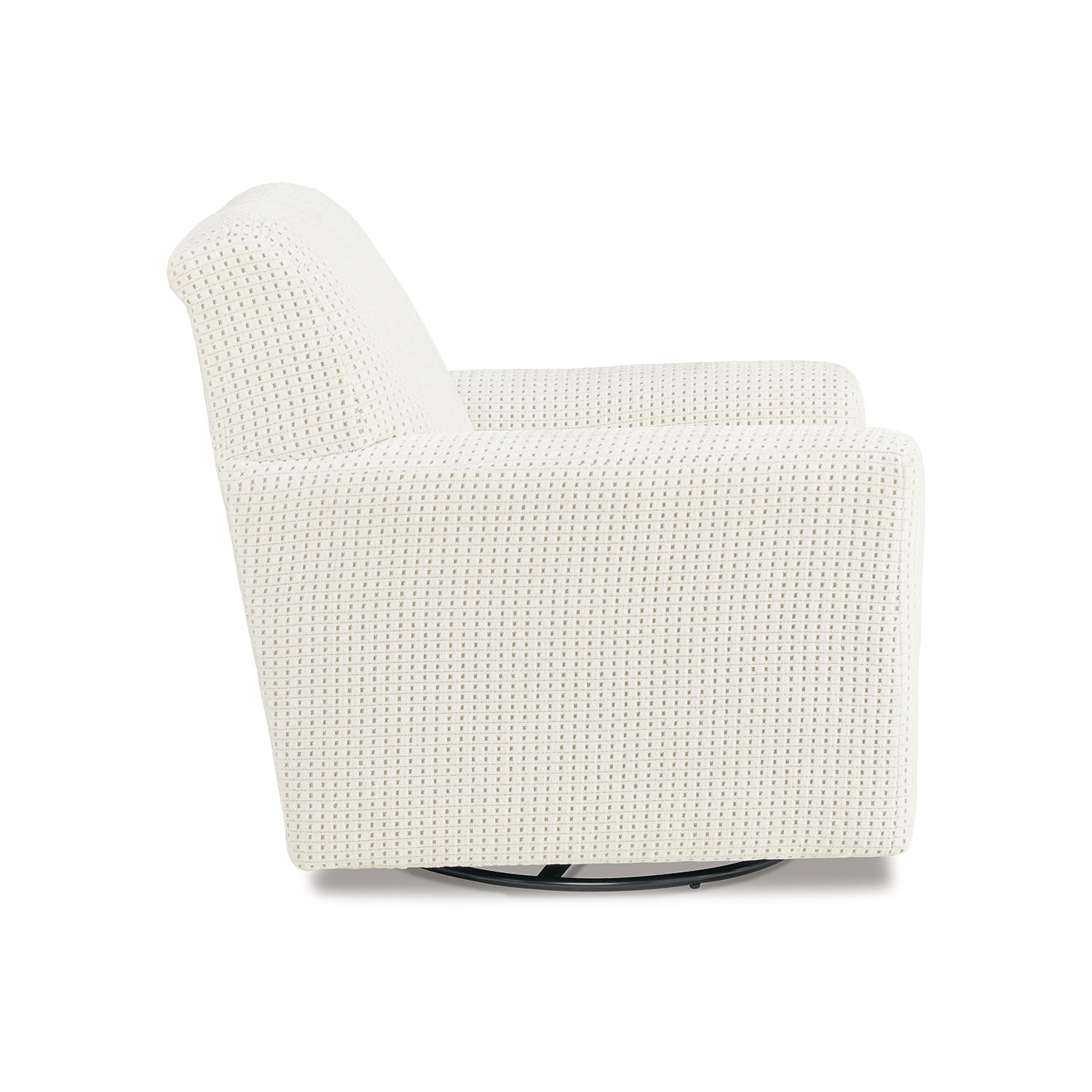 Accent chair. Upholstered in ivory grid patterned polyester fabric. Tight back and loose seat cushion. Metal swivel glider base.