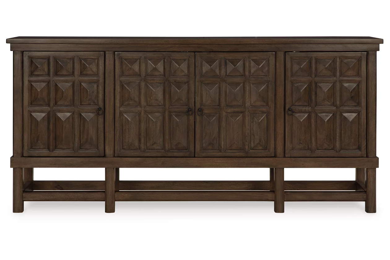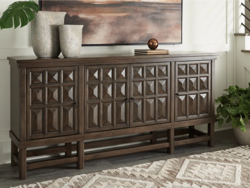 Besides its hide-away storage possibilities, the best thing about the Braunell accent cabinet is its beautifully carved cabinet doors. A step above the rest, this piece is so alluring and versatile. Three interior shelves accommodate your storage needs keeping you organized in the most artistic way.