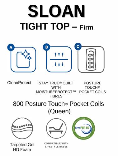 The Sloan Firm Tight Top mattress by Sealy Posturepedic features the CleanProtect™ cover to help maintain freshness and to reduce bacterial-associated staining, the Stay True® Quilt with MoistureProtect™ Fibers designed to draw moisture away from your body helping to keep you more comfortable, the SealySupport™ Gel HD Foam, Targeted Gel HD Foam to ensure your body stays properly supported, and teh Sealy StableEdge® HD with Posture Touch® Pocket Coils for enhanced stability and for even more targeted support and to reduce motion transfer.