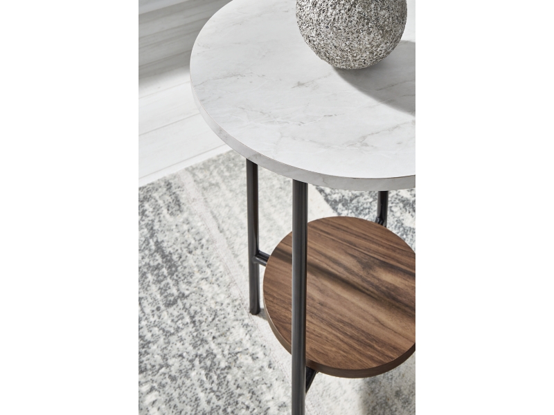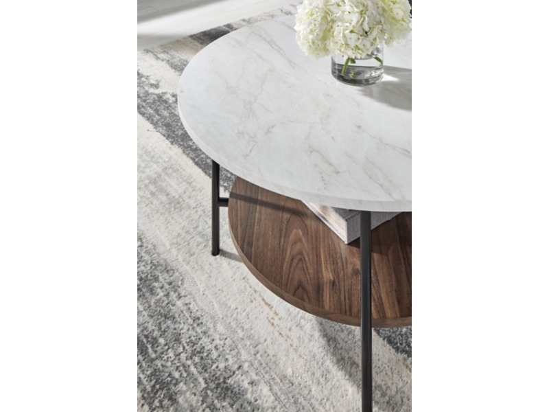 Round out your seating area with this table set. The clean-lined profile is simple, yet striking—while the faux Carrara marble tops are anything but ordinary. Black tubular metal frames, along with open storage shelves with a light natural wood grain pattern, work beautifully together from every angle.