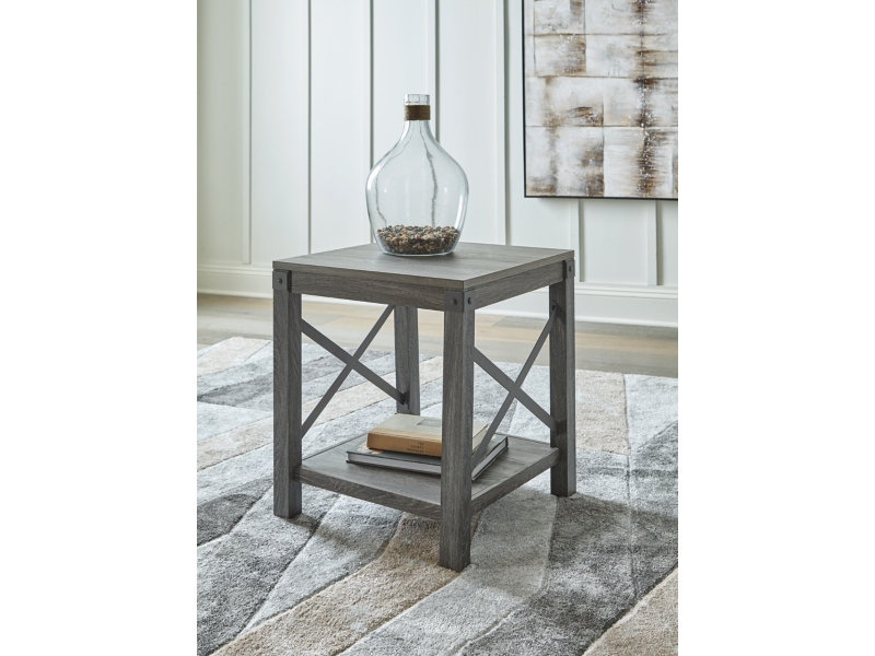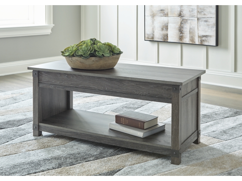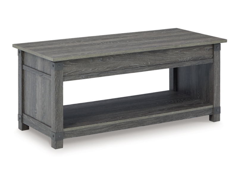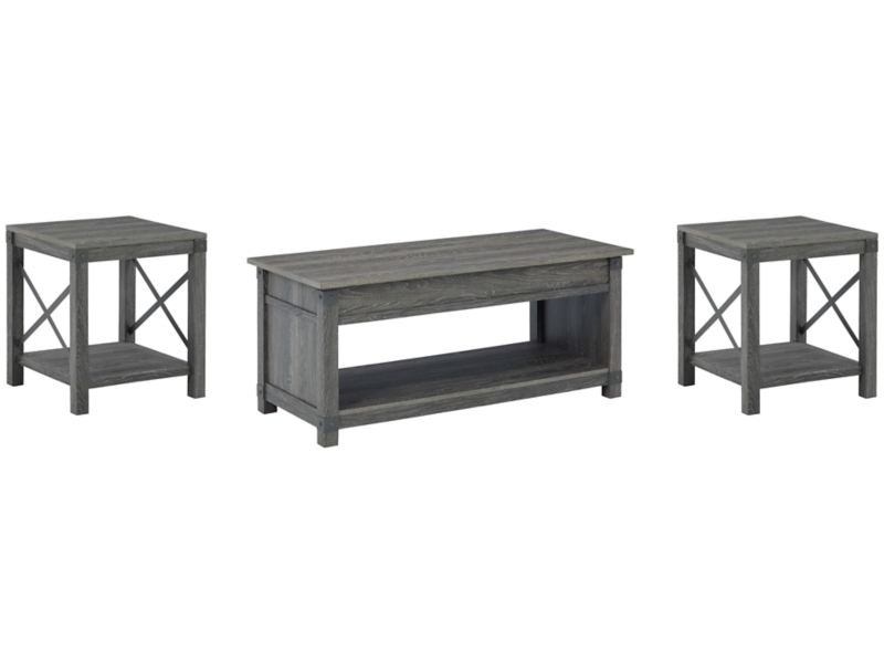 Raise the bar on modern farmhouse design with this accent table set. Sporting a grayish brown replicated wood grain effect, the coffee table's handy spring-loaded mechanism brings the tabletop closer to you. This versatile table makes it easier than ever to eat, work or play from the comfort of your sofa. A pair of coordinating end tables completes the set in style.