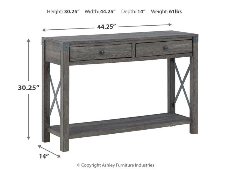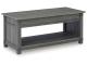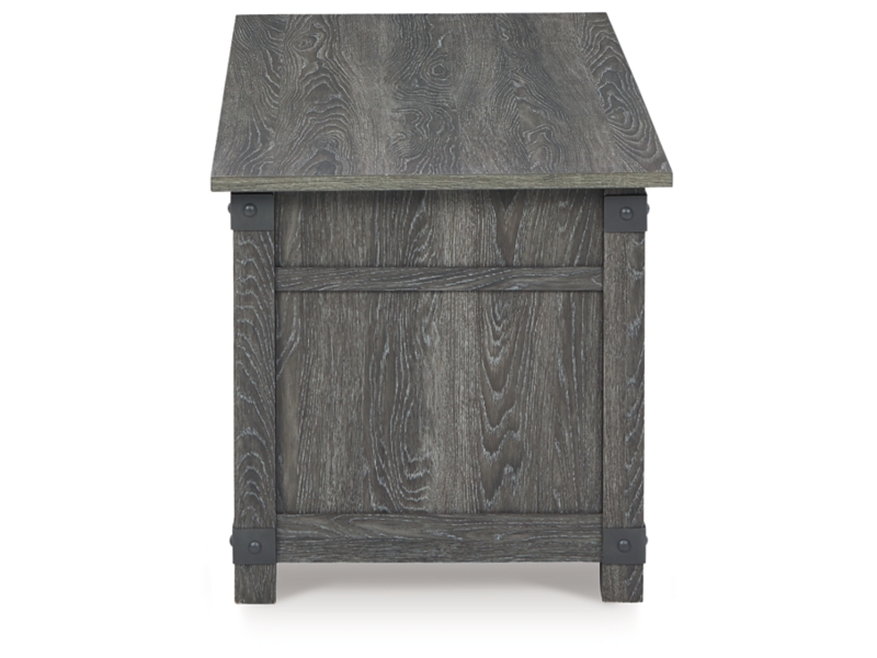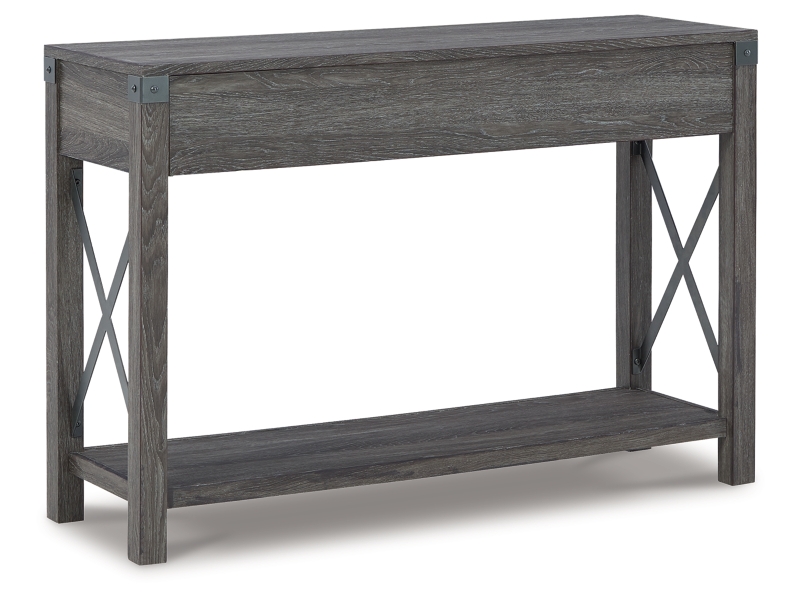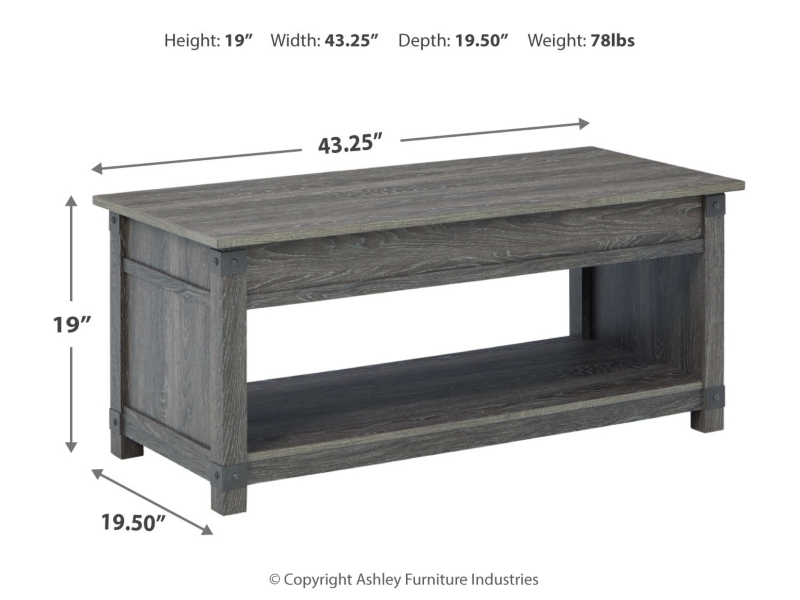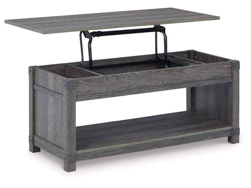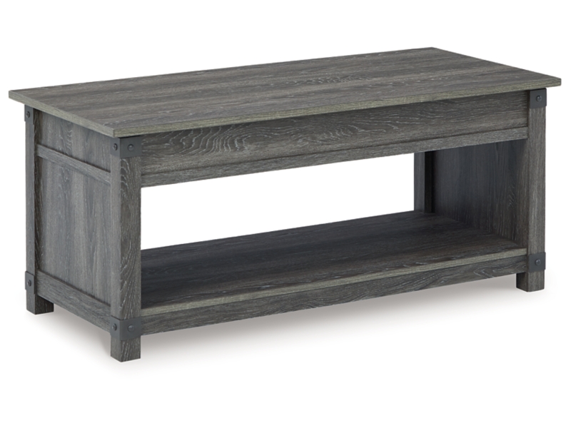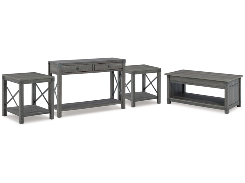 Open the door to modern farmhouse style with this lift-top coffee table. The beautiful woodgrain look and classic crossbuck metal accents are a cool touch, while the lower shelf provides surface space for fashionable home accessories. Sporting a gray replicated wood grain effect, its handy spring-loaded mechanism brings the tabletop closer to you. This versatile table makes it easier than ever to eat, work or play from the comfort of your sofa. 2 end tables and console included.