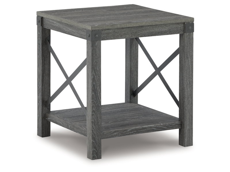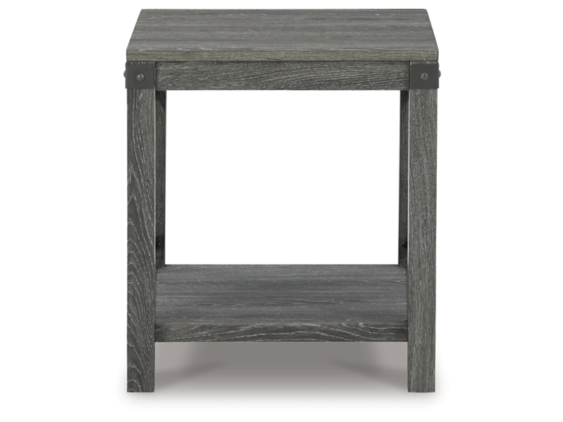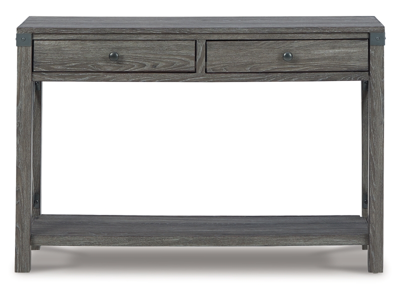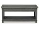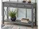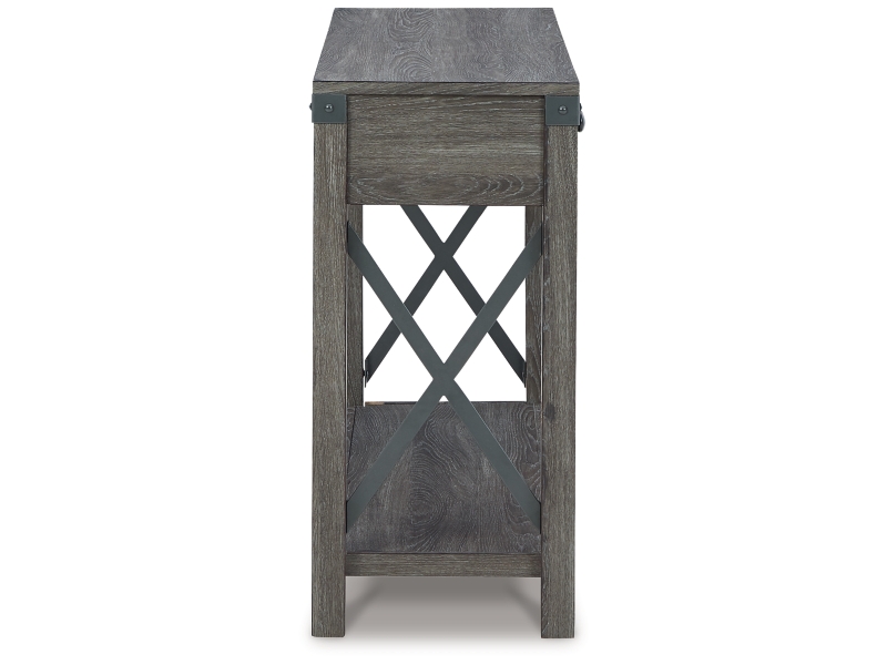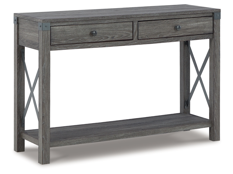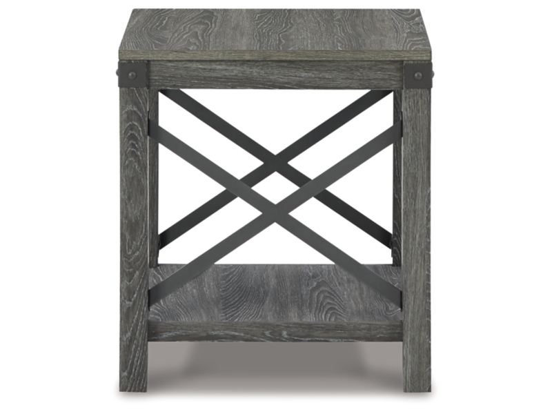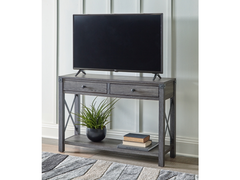Open the door to modern farmhouse style with this lift-top coffee table. The beautiful woodgrain look and classic crossbuck metal accents are a cool touch, while the lower shelf provides surface space for fashionable home accessories. Sporting a gray replicated wood grain effect, its handy spring-loaded mechanism brings the tabletop closer to you. This versatile table makes it easier than ever to eat, work or play from the comfort of your sofa. 2 end tables and console included.
