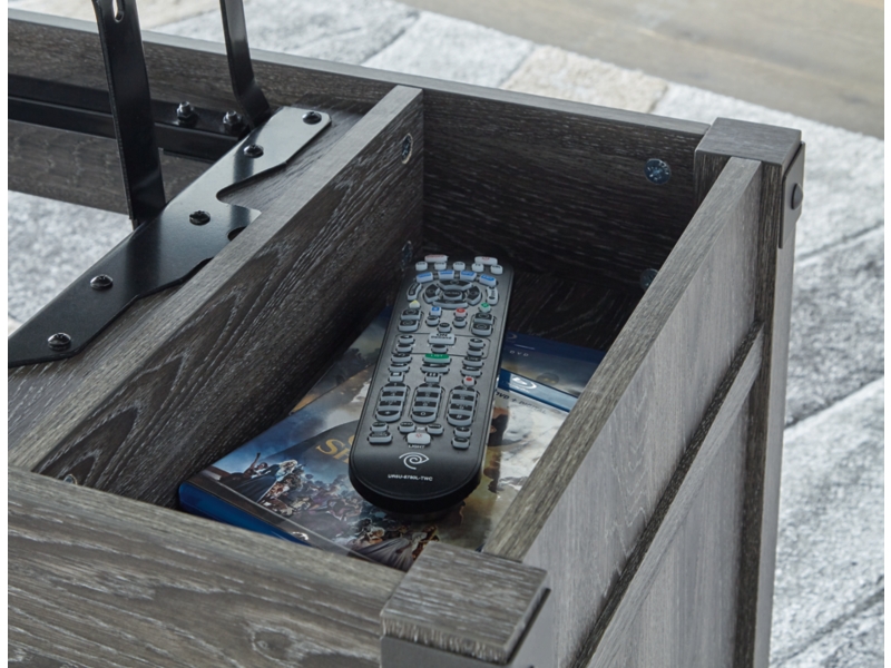Modern Farmhouse design. Made with engineered wood substrate and decorative paper laminate in a replicated gray wood. Cross-buck metal accents are finished in a gun metal color. T175-9 cocktail table features a lift top with storage trays underneath.