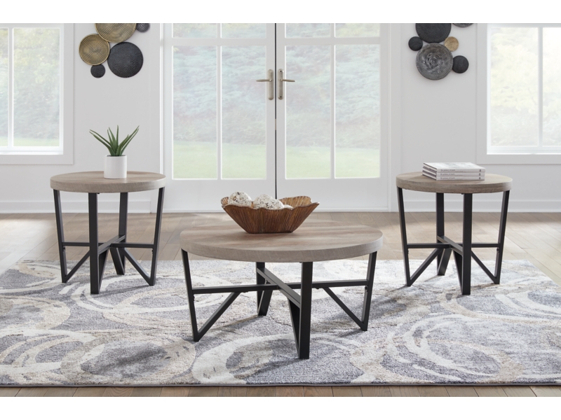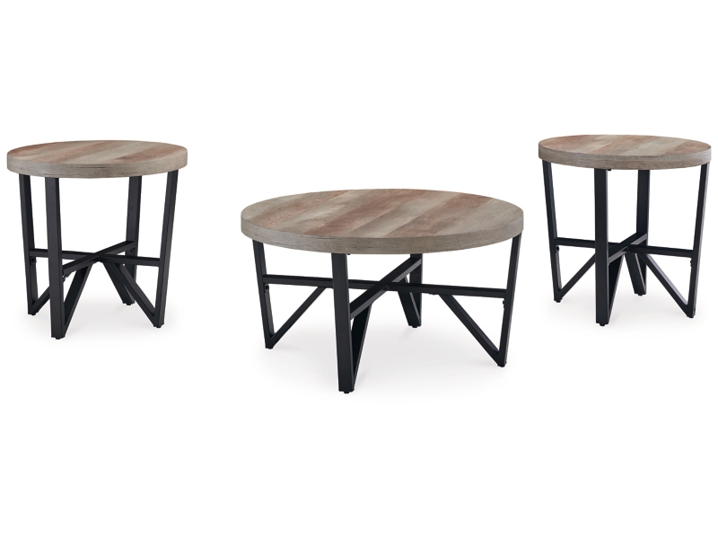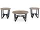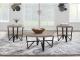 Urban contemporary design. Made with tubular steel frames, decorative laminate and MDF substrate. Thick tabletops feature a replicated reclaimed lumber look. The steel leg assemblies are finished with a durable matte black powder coat. Round table designs work nicely with smaller sofas and sectionals for small space living. 3-in-1 pack.