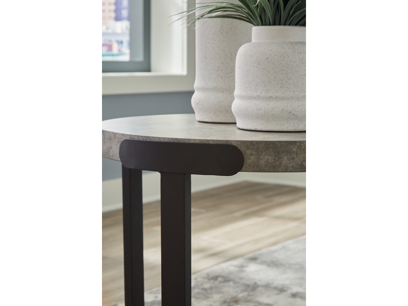 Casual Contemporary design. Made with MDF substrate and decorative laminates with metal frames. Tops feature a durable Melamine surface with a faux cement pattern and texture. Lower shelves are laminated with a light natural Oak wood grain pattern. The metal legs contrast nicely with a dark bronze colored powder coat for a durable lasting finish. The cocktail table has casters for easy mobility. Round table designs work nicely with smaller sofas and sectionals for small space living. 3-in-1 pack. T383-113 Square 3 pack tables. The square end table measures 23.5"W x 23.5"D x 23.5"H.