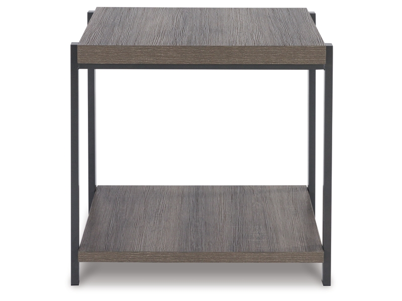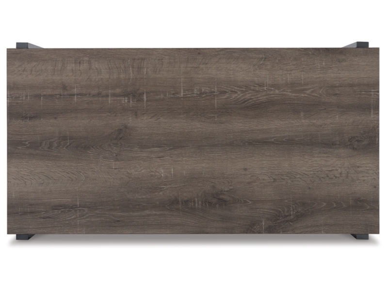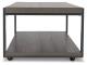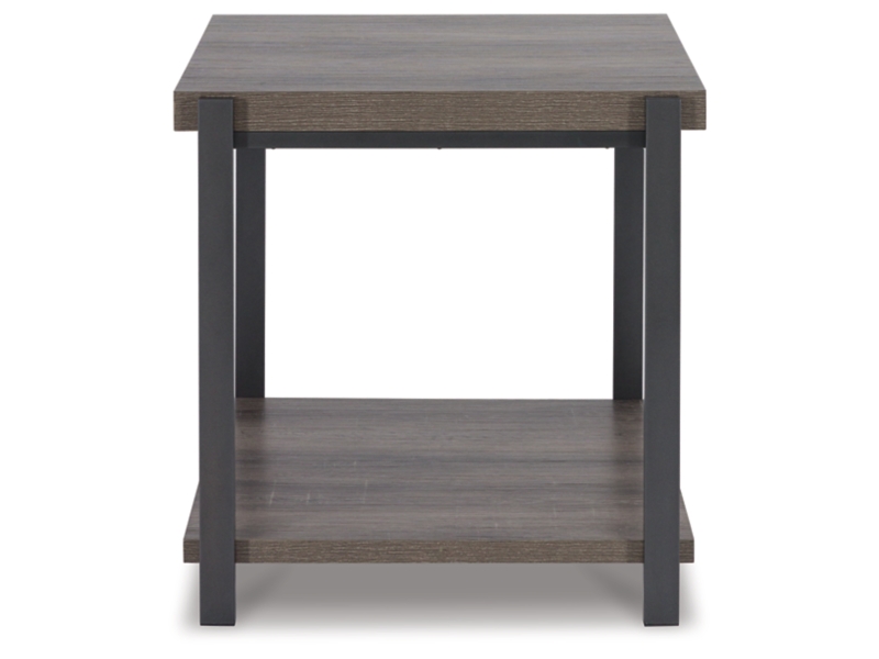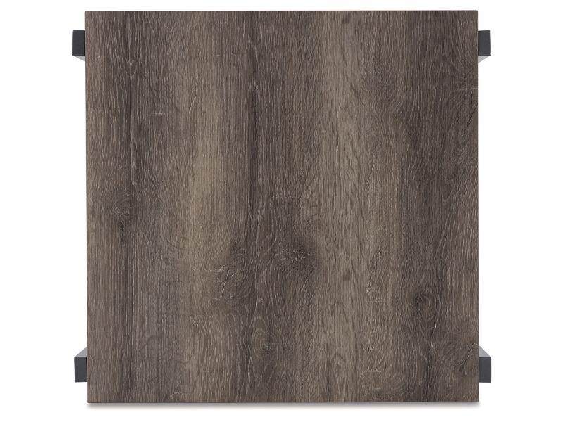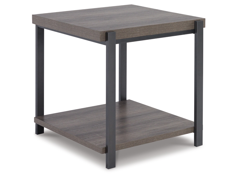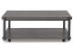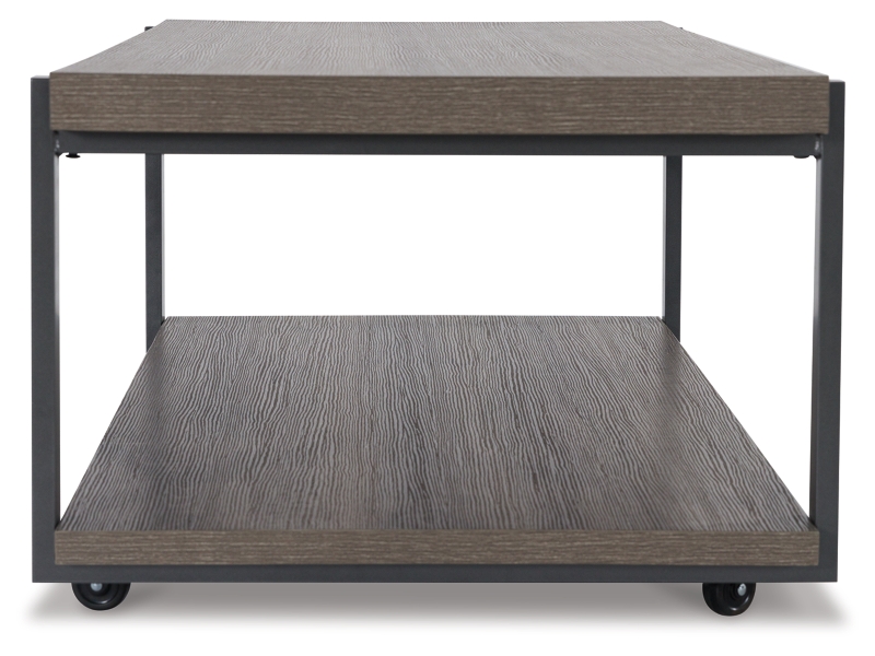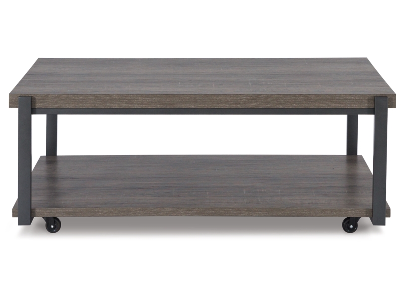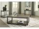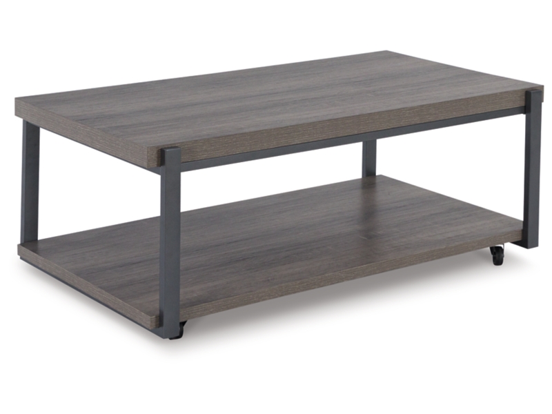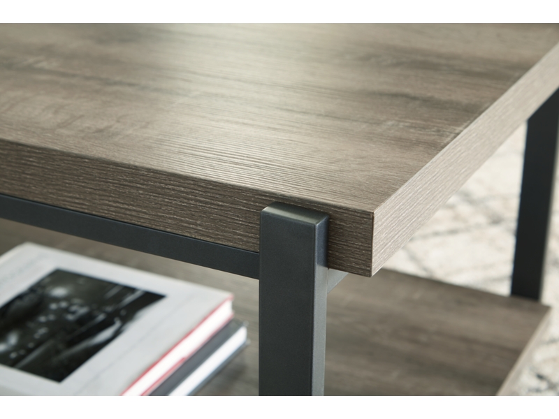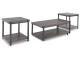 Casual contemporary design. Made with metal frames, MDF substrate and a decorative paper laminate. Laminate features a replicated wood grain with a weathered gray coloration. Metal frames are finished with a gunmetal colored powder coat for a durable, long lasting surface. Each table has a open storage shelf below. The cocktail table has casters for easy mobility. 3-in-1 pack.