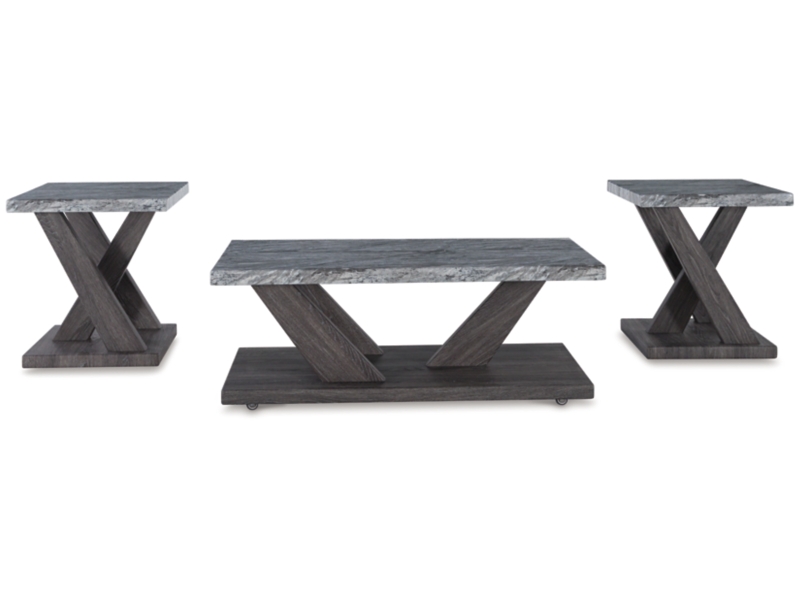 Contemporary styling. Made with decorative paper laminate and MDF substrate. Two-tone finish consisting of faux gray marble tops and weathered gray wood grain legs and shelf. Cocktail table features casters for easy mobility. 3-in-1 pack.