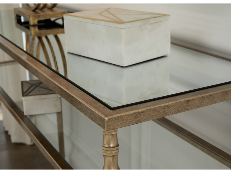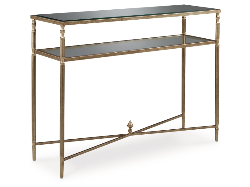 This sofa table gives traditional design a wonderful sense of relevance. Its details, which include embellished legs and a stretcher with a decorative center finial, are timeless classics. The aged goldtone coloration is the essence of relaxed elegance. An underlying shelf adds style, substance and functionality.