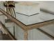 Traditional styling. Made with metal frames, clear glass shelf, and inset mirror top. Finished in an aged gold coloration. Round legs with bobbins and reeded embellishments. Lower "X" stretcher with decorative center finial.
