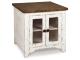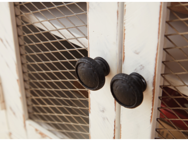 Rustic Farmhouse styling. Distressed vintage painted white finish contrasted with aged natural Pine color tops. Inset metal grille accents. Cocktail trunk features dual lids for easy access to the large capacity storage. End tables feature door cabinets for extra storage space.