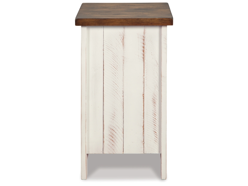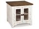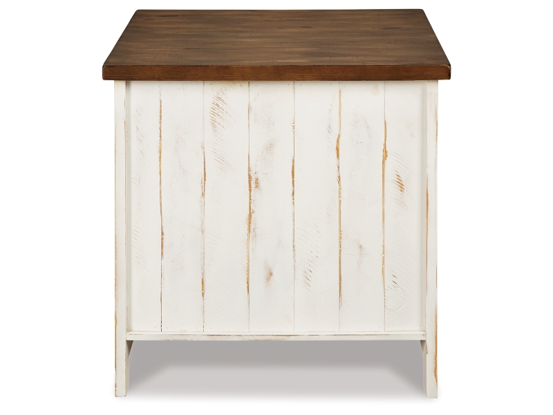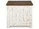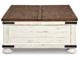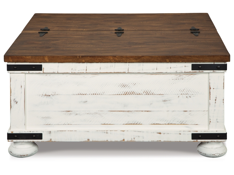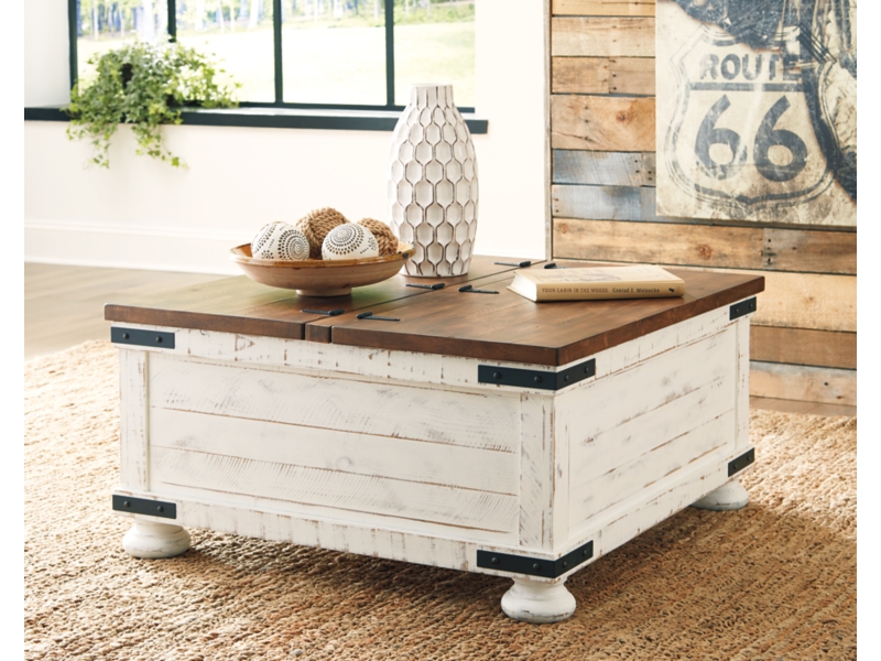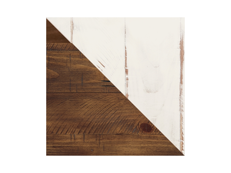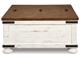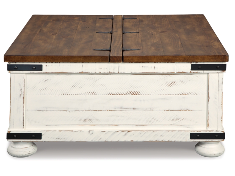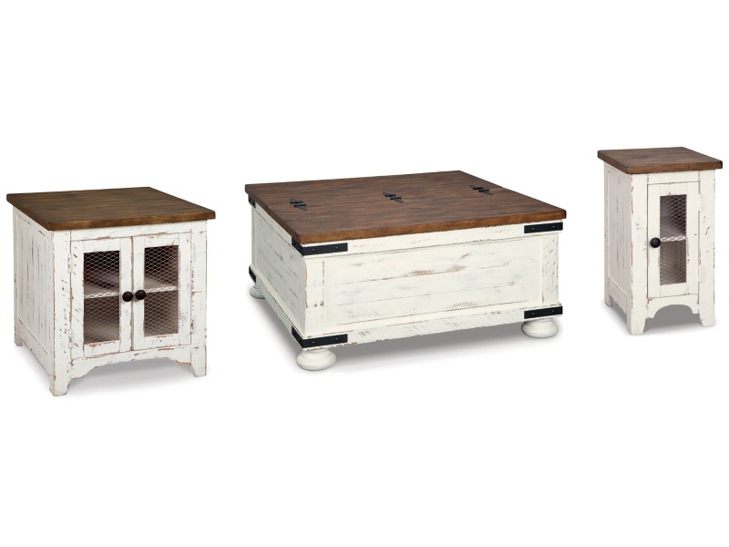 Double take. Sporting a two-tone finish, dual-sided lid design and expansive storage space, this square coffee table and 2 end tables takes the art of rustic farmhouse living to a new level. Designer touches include plank-effect styling, heavy distressing and industrial bracket hardware.