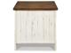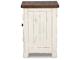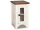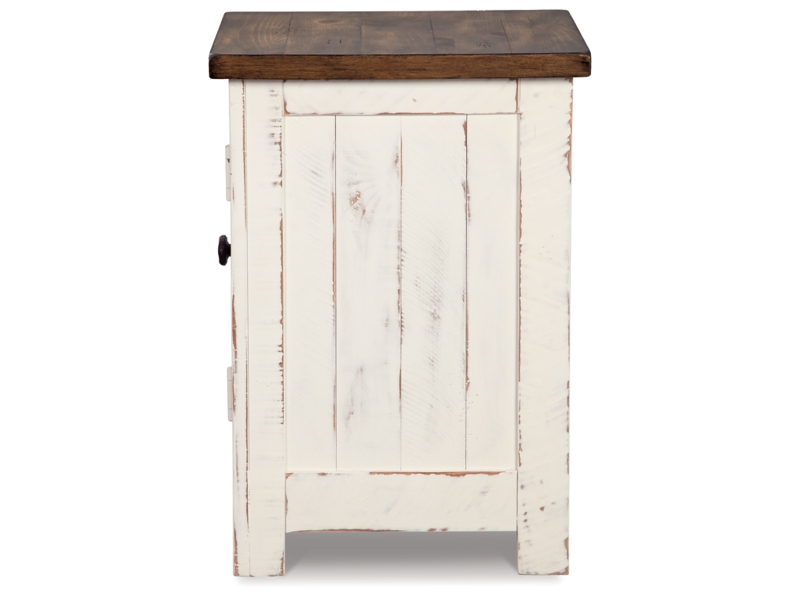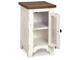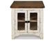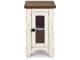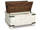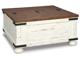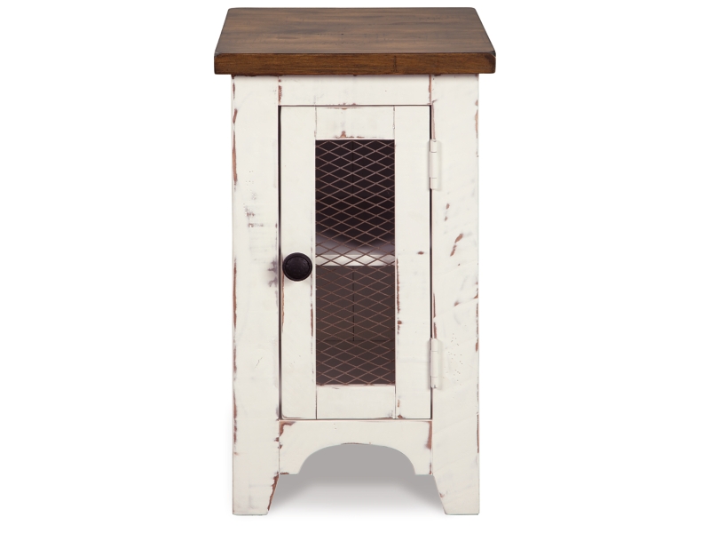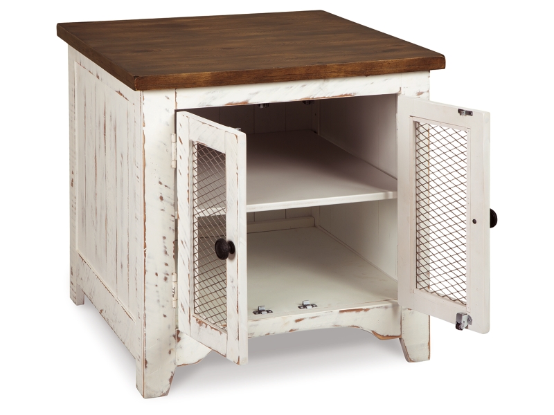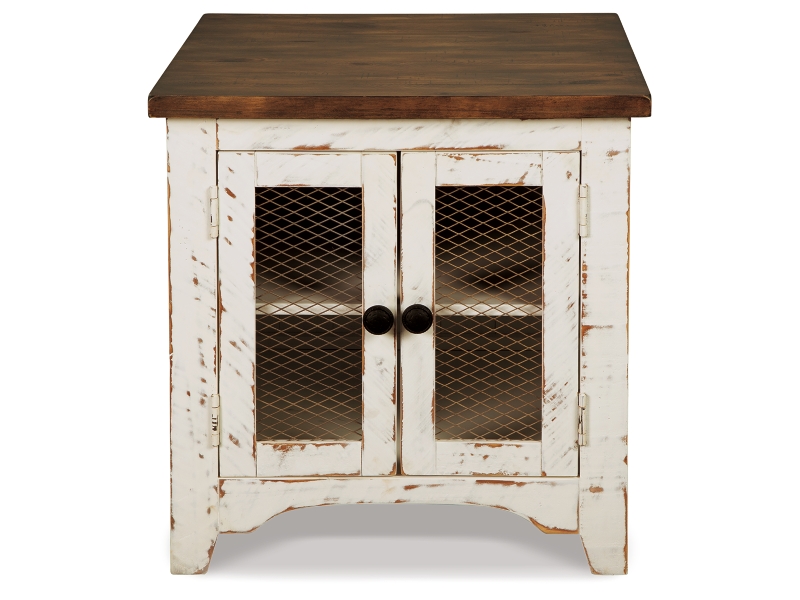 Rustic Farmhouse styling. Distressed vintage painted white finish contrasted with aged natural Pine color tops. Inset metal grille accents. Cocktail trunk features dual lids for easy access to the large capacity storage. End tables feature door cabinets for extra storage space.