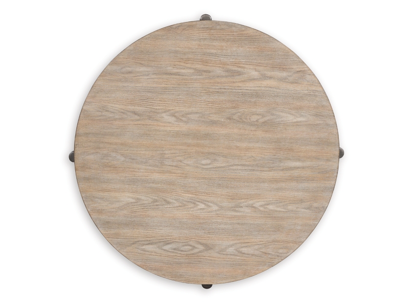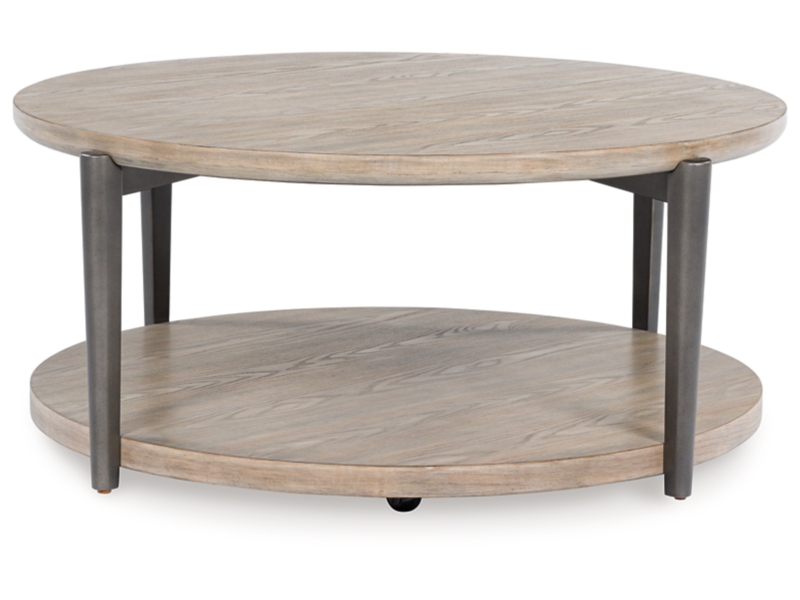 Industrial Contemporary design. Made with solid wood legs and select hardwood veneer with MDF substrate. Finished in a trend-right whitish brown wood-tone, contrasting painted metallic legs have a thin-line aesthetic for a modern look. The cocktail table has casters for easy mobility.