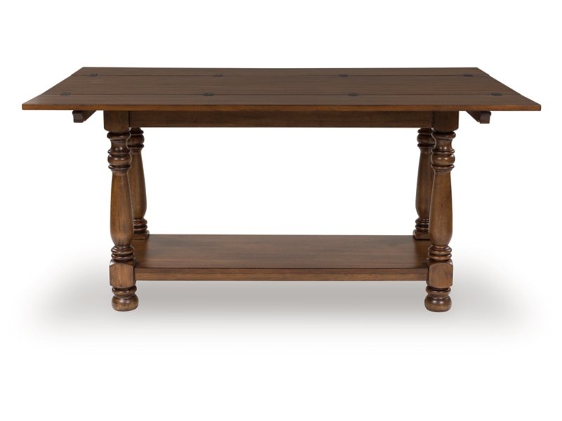 Casual traditional styling. Made with hardwood solids, veneers, and MDF substrates. Features a complex rich brown finish that compliments any living room. Sofa table features flip-top that extends to form a 38” x 60” table for extra dining space.