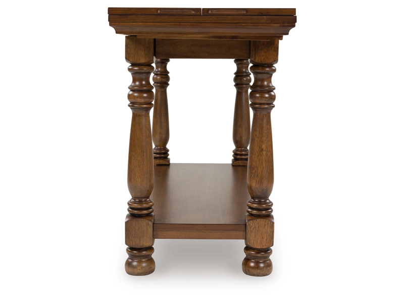 Traditional style doesn’t have to be stuffy. It can feel warm, inviting and beautifully in the moment. Case in point: this flip-top sofa table. Showcasing uniquely detailed leg posts, it has an allure all its own. Equally special is the rich brown finish, which exudes a mood of timeless charm. And when you need an extra dining space, simply fold open the table's hinged panels. How's that for relaxed refinement?