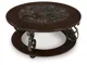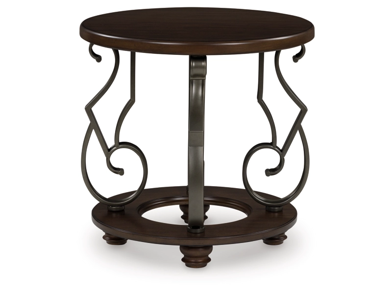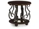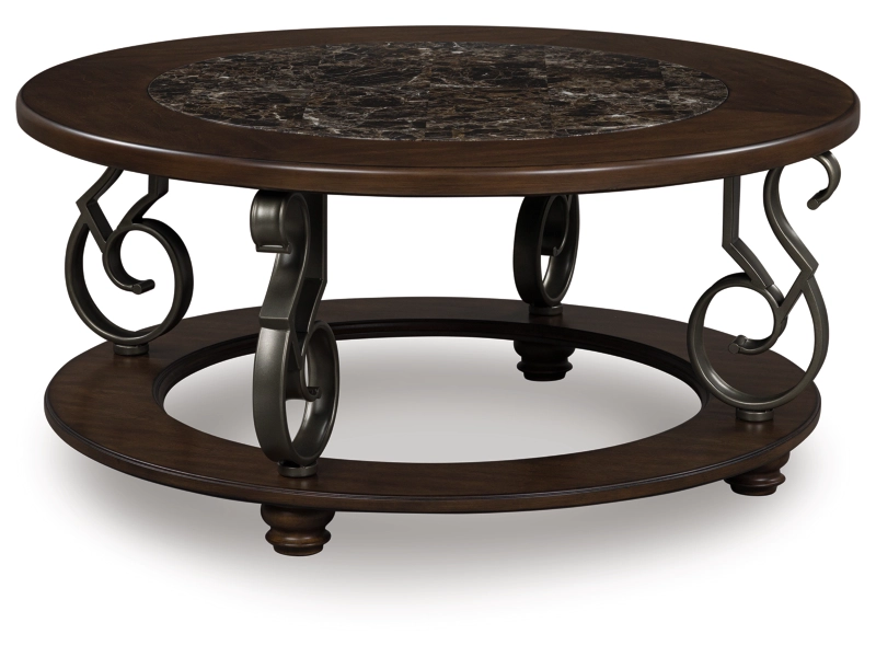 Opulent traditional styling. Made with Birch veneer, decorative paper laminate and MDF substrate. Finished in a warm brown wood-tone. Table tops feature inset faux marble laminate with a durable polyurethane topcoat for lasting beauty. Ornate metal legs are finished in a durable dark pewter powder coat.