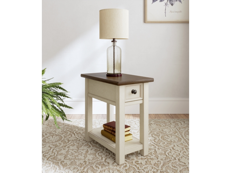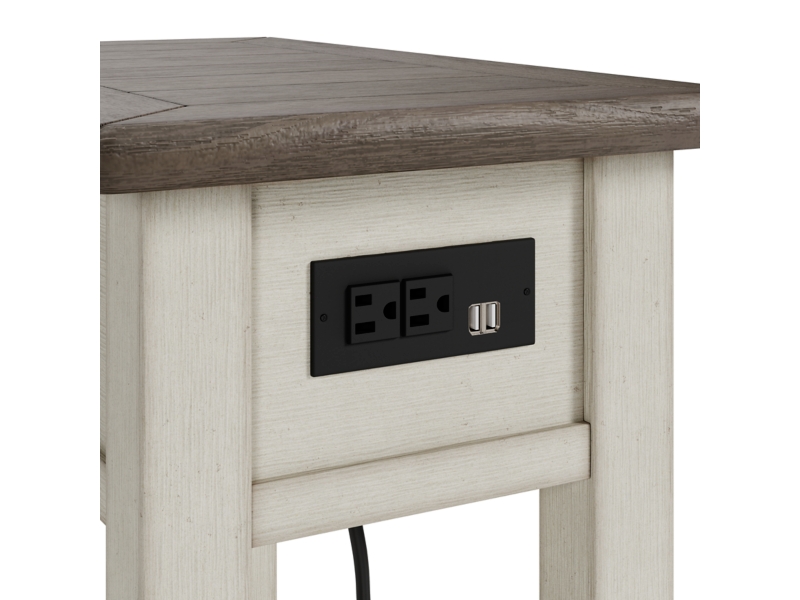Made with select hardwood solids and white oak veneers in a weathered gray finish. Paint grade materials form the base and finished in an antique white color. Tables feature plank and frame top and casual styling throughout. Cocktail features 4 working drawers and lift top. Casters for mobility. T637-7 chair side table has pullout tray, large door for storage and lift up top (back section) that exposes an AC power supply with 2 USB charging ports. Also included in the collection are a sofa table and end table with generous proportions. T637-107 has a plank-styled top. Smooth gliding drawer. Integrated 110V power supply with dual USB charging ports. Black faceted hardware.