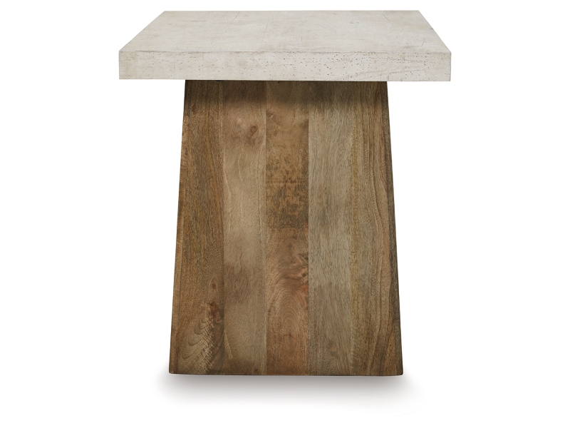 Casual contemporary design. Made with solid Mango wood, decorative melamine laminate and MDF substrate. Finished in a light brown wood tone. Tops feature a thick slab look made with a faux cement melamine for a long lasting durable surface. The cocktail table features a double plinth base with shelf and casters for easy mobility. Matching end tables with double plinth base.