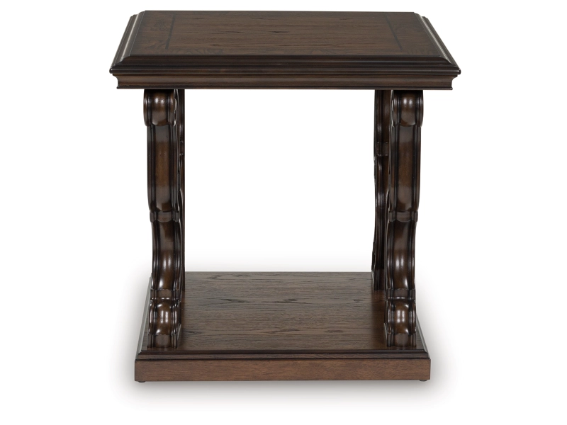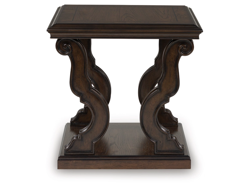 Lavish, luxurious living is within reach when you add this end table to your living room. Recalling a classic sense of refinement, its elegant scrolled legs make a beautifully bold statement. Ornate details on the apron add an air of opulence to the regal dark brown finish. The look is timeless. The feel? Right at home.